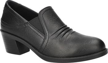 Stretchy goring and a side-zip closure add ease to a flexible clog featuring a ruched vamp and block heel for extra style points.