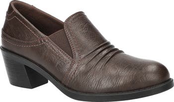 Stretchy goring and a side-zip closure add ease to a flexible clog featuring a ruched vamp and block heel for extra style points.
