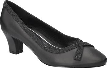 Refresh your day-to-night selection with this kitten heel pump traced with glittering trim and a neat bow. Enhanced with an Easy Motion by Easy Street ultra-light insole and a flexible Comfort Wave construction, it offers superior support.
