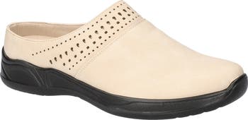 Laser-cut perforations trim a monochrome mule that delivers day-long comfort with a pillowy footbed and lifted by a chunky heel.