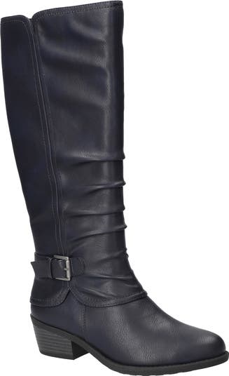 Subtle ruching and an antique buckle highlight the equestrian-inspired profile of a knee-high faux-leather boot set on a cushioned footbed and low, stacked heel.