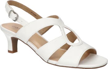 A V-cut topline and teardrop vamp cutout bring striking dimension on a slingback sandal grounded by a cushioned footbed and flexible rubber sole.