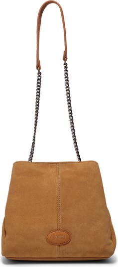 Bring contemporary style to everyday looks with this supple suede shoulder bag that stands out thanks to its earthy tone and contrasting chain strap.