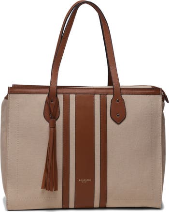 Leather trim neatly outlines a structured canvas tote bag that has an ultraspacious interior to make it an ideal choice for workdays, weekend getaways and everything in between.