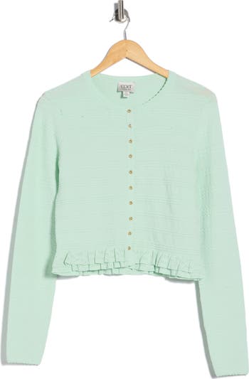 Frilly ruffled edges amplify the charm of a cardigan that can be worn buttoned up or layered over other wardrobe favorites.