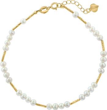 Glossy freshwater pearls bring an air of elegance to this textured station bracelet crafted in warm 14-karat gold.