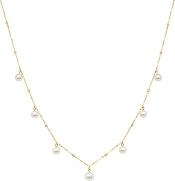 Catch light with every movement in this 14-karat gold necklace stationed with dangly freshwater pearls to complete and elegant look.