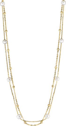 Get an effortless layered look with this double-strand sterling silver necklace plated in 14-karat gold and punctuated with freshwater-pearl stations.