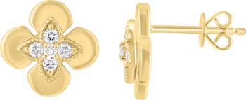 Sparkly round diamonds center polished flowers on these elegant stud earrings crafted from sterling silver and plated in warm 14-karat yellow gold.