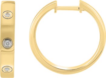 Dainty bezel-set round diamonds bring luxurious sparkle to these slender huggie hoop earrings crafted from sterling silver and plated in warm 14-karat gold.