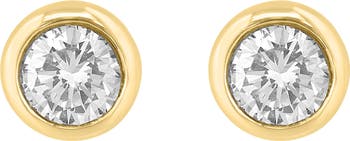 Bezel-set round diamonds bring luxurious sparkle to these dainty stud earrings crafted from sterling silver and plated in warm 14-karat gold.
