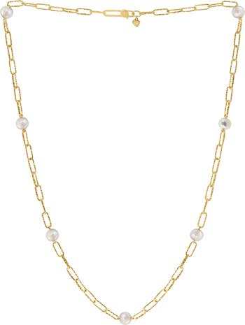 Lustrous freshwater pearls enhance the shine of this hammered paper clip–chain necklace crafted from sterling silver and plated in warm 14-karat gold.