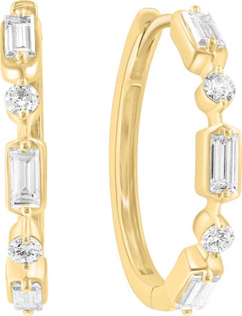 Sparkly baguette- and round-cut lab-grown diamonds trace these slender huggie-hoop earrings crafted from sterling silver and plated in warm 14-karat gold.