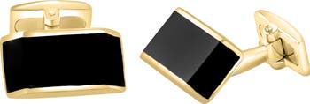 Evoke polished style with these onyx-inset cuff links crafted from sterling silver and plated in warm 14-karat yellow gold.