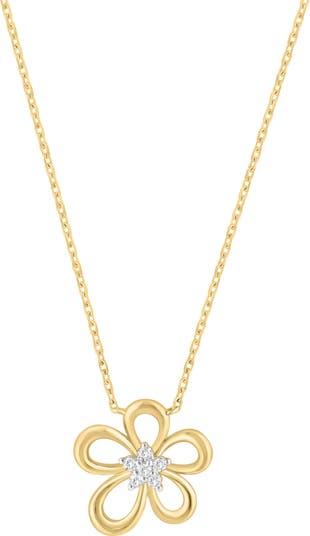 Sparkly pavé diamonds center this asymmetric flower pendant necklace crafted from sterling silver and plated in warm 14-karat yellow gold.