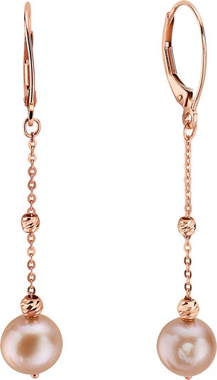 Pink cultured freshwater pearls suspend from beaded-station drop earrings crafted from 14-karat rose gold for romantic shine.