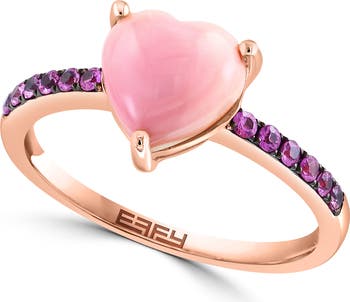 Tiny pink sapphires accent the band of this heart-shaped opal ring crafted from 14-karat-rose gold.