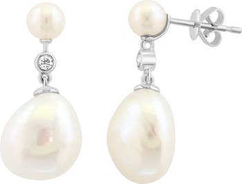 Lustrous freshwater pearls and bezel-set round diamonds enrich these elegant drop earrings crafted from polished 14-karat white gold.