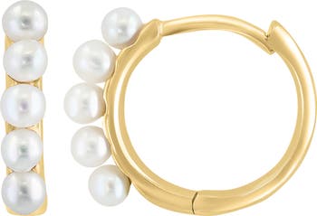 Lustrous freshwater pearls surround the front of these 14-karat yellow gold hoop earrings.