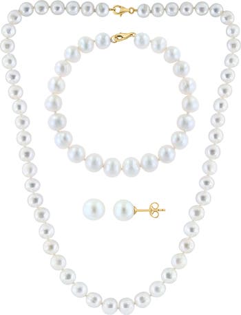Complete an elegant ensemble with this lustrous 14-karat gold freshwater pearl set including stud earrings, a line bracelet and matching necklace.