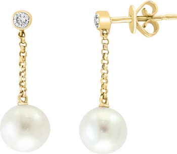 Sparkly bezel-set round diamonds and lustrous freshwater pearls enrich these swingy drop earrings crafted from warm 14-karat yellow gold.
