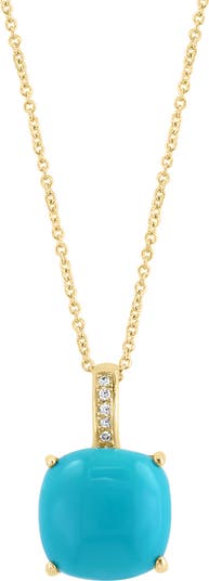 Diamonds add sparkle to the bail of a turquoise pendant that adorns this elegant 14K yellow gold necklace.