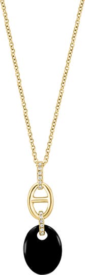An elegant 14-karat gold necklace suspends sparkling pavé diamonds, a polished mariner link and oval onyx pendant for sophisticated shine.