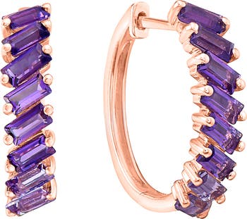Upgrade your style with huggie hoop earrings with amethyst stones and a 14-karat rose gold-plate for a brilliant shine.