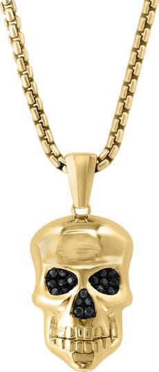 Round-cut black spinel stones fill in the eyes and nose of this skull pendant strung on a box-chain necklace.