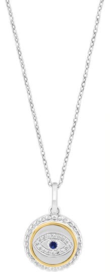 A circular evil eye pendant adorned with diamonds and a pretty blue sapphire swings off a delicate chain crafted from polished sterling silver.