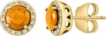 Brilliant diamonds frame round-cut gemstone stud earrings fashioned from 14-karat gold for a lasting luster.