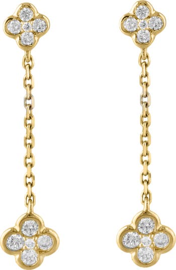 Bright-white diamonds lend luxurious sparkle to polished drop earrings crafted from sterling silver plated in warm 14-karat gold.