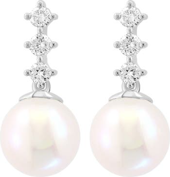 Rows of bright-white diamonds lend elegant shine to the posts of polished earrings that suspend freshwater-pearl drops to illuminate your lobes.