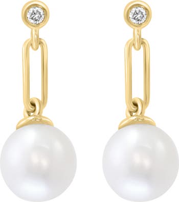 Show off elegant sparkle with these dainty drop earrings composed of bezel-set round diamonds above sleek paper clip links and lustrous freshwater pearls.