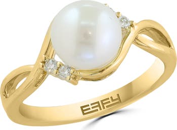 Bright-white diamonds frame the lustrous freshwater pearl that sits perfectly atop a polished ring crafted from 14-karat gold.