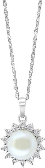 A sun-shaped pendant centered by a freshwater pearl and flanked by a halo of bright-white diamonds sits prettily at the center of a delicate chain necklace crafted from sterling silver.