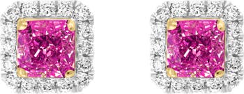Sparkly diamond halos frame square-cut rubies on these elegant stud earrings crafted from sterling silver with a two-tone finish.