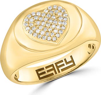 Bright-white diamonds make up the heart-shaped center of a polished signet ring that's warmly plated in 14-karat gold.