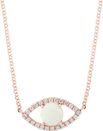 A delicate chain necklace crafted from 14-karat gold is centered by an evil eye pendant shimmering with an opal and diamond halo.