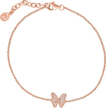Pavé diamonds add elegant sparkle to this American-made butterfly charm bracelet plated in a rosy goldtone.