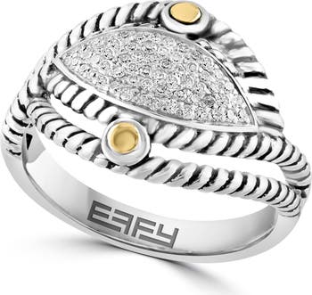 Dainty round-cut diamonds sparkle across the marquis face of a sterling silver ring with a twist-textured frame and 14-karat gold trim.