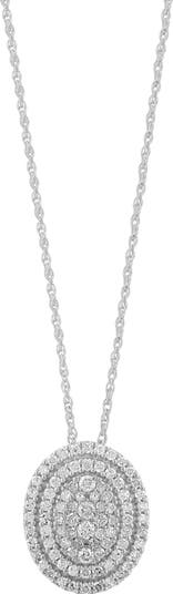 A delicate chain necklace crafted from sterling silver is centered by an oval-shaped pendant adorned with rows of bright-white diamonds.