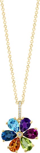 A delicate chain crafted from 14-karat gold is strung with a flower-shaped pendant suspended from a diamond-adorned bezel and centered by a multitude of semiprecious stones.