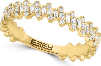 Round- and baguette-cut diamonds bring brilliant sparkle to a polished ring that can be worn solo or stacked for a bolder look.