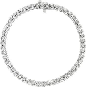 A stream of brilliant round diamonds creates a halo effect on this glowing tennis bracelet set in sterling silver.
