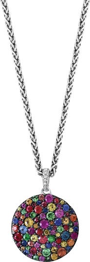A diamond-adorned bezel tops the rounded pendant that swings from a sterling silver chain and is centered by pavé-set tsavorite in a multicolored palette to bring striking detail to elevated looks.