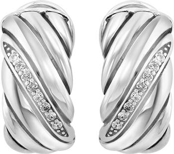 Round-cut diamonds further the shine of polished omega earrings with a twist texture for trendy styling.
