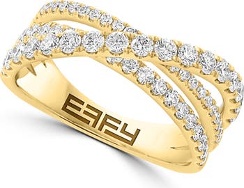 Round-shaped white lab-grown diamonds encrust the top of this crisscross ring crafted from warm goldtone plated sterling silver.