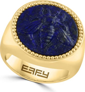 A carved insect rests on top of this lapis lazuli ring framed with beading and crafted from sterling silver plated in 14-karat gold.
