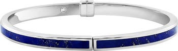 A slim bangle bracelet shaped from sterling silver is detailed with stone for a pop of color against any ensemble.